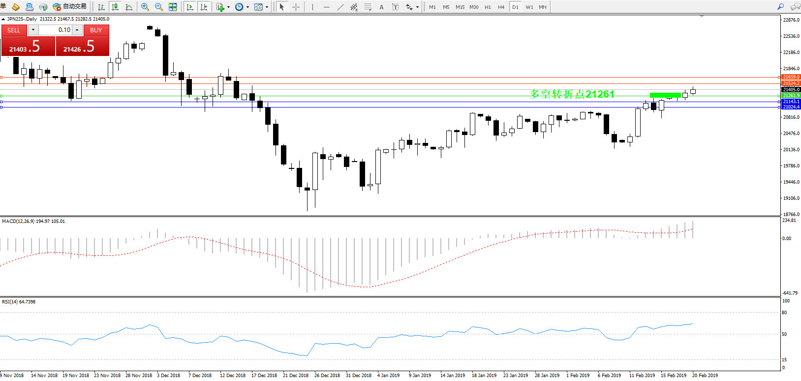交易策略:21261上方看涨,目标21524、21659