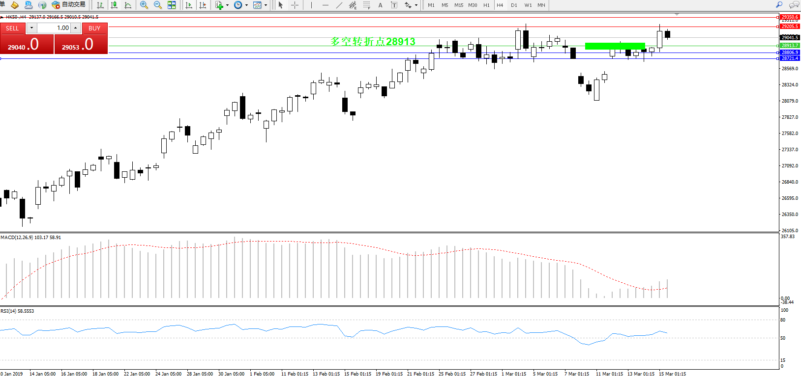 恒指HK50 ——4小时K线图显示: