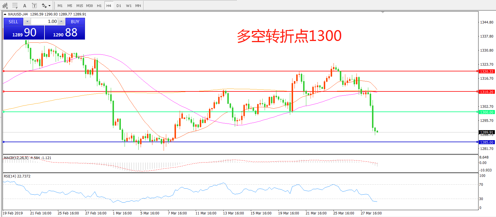 交易策略:在1300.00之下看跌,目标1285.00 1270.00