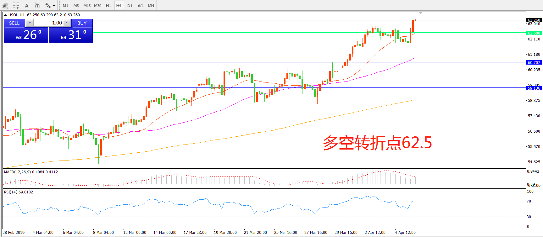 美国油服公司贝克休斯周五(4月5日)公布数据显示,截至4月5日当周,美国石油活跃钻井数急升15座至831座,终结六周连降趋势且创去年5月来最大单周增幅。但减产行动以及中美贸易谈判乐观预期带来的提振效果依然显著。美国WTI原油价格盘中最高触及63.34美元/桶,最终收涨0.98美元,报63.20美元/桶,本周大漲4.89%。