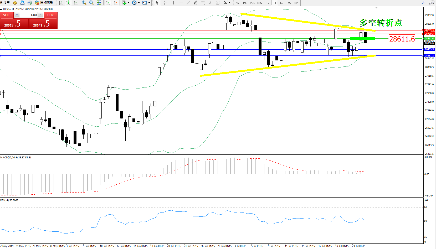 恒指HK50 ——4小时K线图显示:
