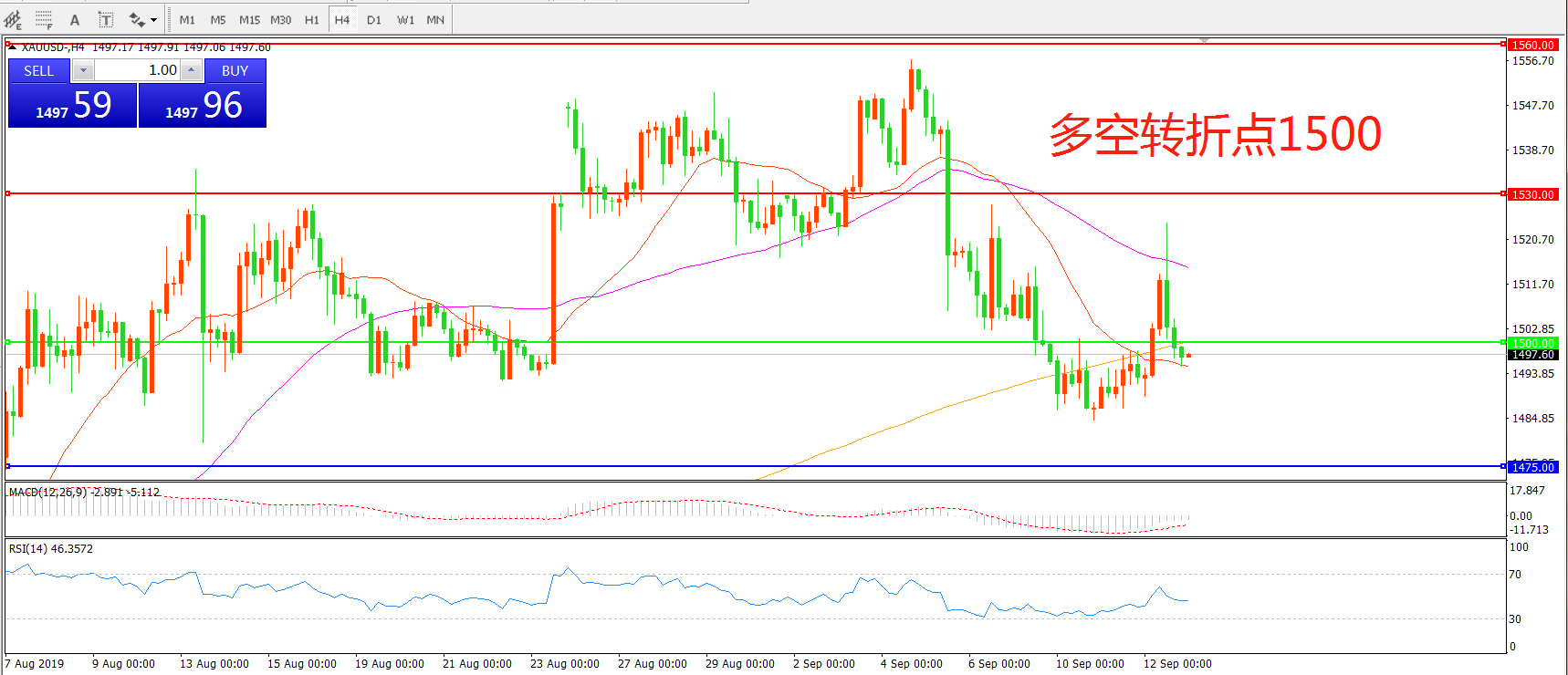 受到欧洲央行宽松举措以及中美贸易方面的消息的影响,金融市场短线剧烈波动, 根据央视新闻报道,在商务部举行的例行新闻发布会上,针对美方宣布将推迟加征中国关税的问题,中方对美方释放的善意的行动表示欢迎,中美关系回暖的迹象缓解了市场中的避险情绪,而欧洲央行则火力全开,宣布降息的同时启其量化宽松,央行的宽松政策为金价提供了有力支撑,金价宽幅震荡后最终收报1497.75美元/盎司。