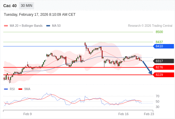 Cac 40 当日内: 短期关键阻力位在8410。