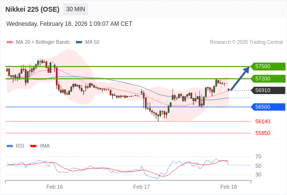 在 56500 之上,看涨,目标价位为 57200 ,然后为 57500 。