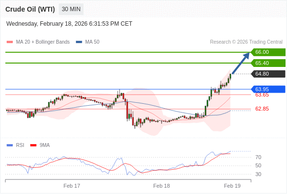 在 63.95 之上,看涨,目标价位为 65.64 ,然后为 66.00 。