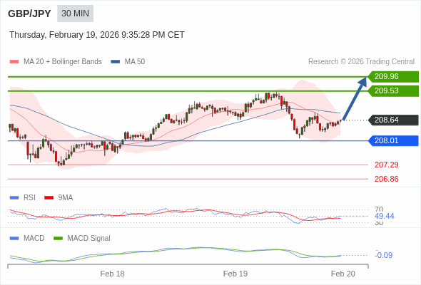 英镑/日元 当日内 : 有上涨的可能,目标价位定在 209.96 。