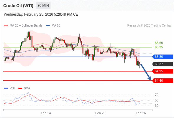 在 65.80 之下,看跌,目标价位为 64.95 ,然后为 64.40 。
