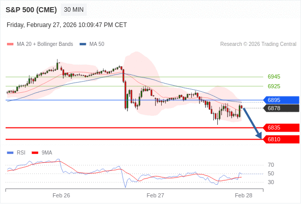 美国标普500指数期货 (H6) 当日内: 短期关键阻力位在6895。