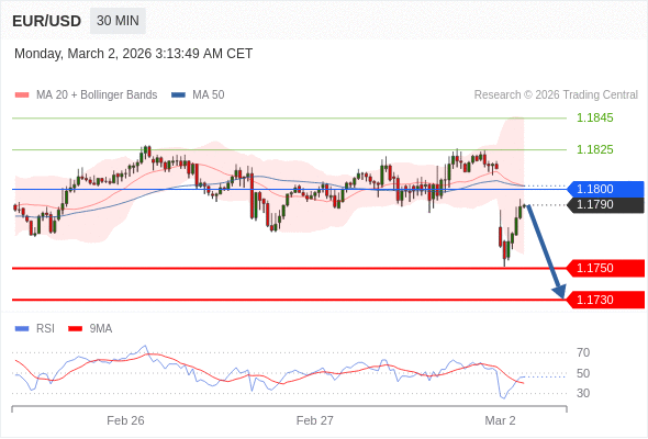 交易策略: 在 1.1800 之下,看跌,目标价位为 1.1750 ,然后为 1.1730 。