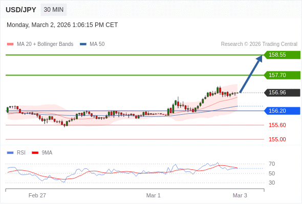 在 156.20 之上,看涨,目标价位为 157.70 ,然后为 158.55 。