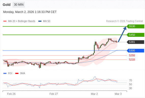 交易策略: 在 5300 之上,看涨,目标价位为 5450 ,然后为 5530 。