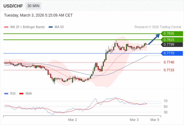在 0.7770 之上,看涨,目标价位为 0.7815 ,然后为 0.7835 。