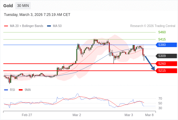 在 5380 之下,看跌,目标价位为 5260 ,然后为 5215 。