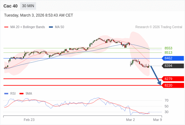 Cac 40 当日内: 下跌趋势。