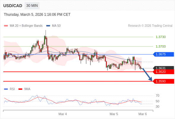 在 1.3675 之下,看跌,目标价位为 1.3620 ,然后为 1.3590 。