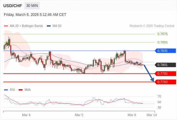 美元/瑞郎 当日内: 朝0.7780运行。