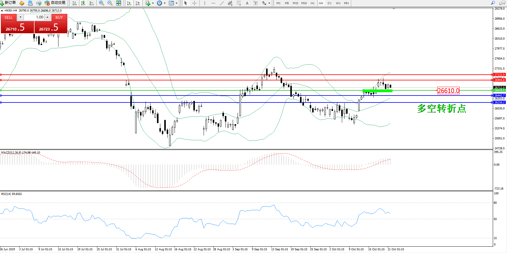 香港恒生指数10月21日(周一)收盘上涨6.10点,涨幅0.02%,报26725.68点;股早上小幅低开4点,恒指低见26658。随后有买盘支持而企稳造好,重上升轨,最多升98点,高见26818。英国脱欧再次出现延期,加之欧美贸易紧张情绪重燃,经济前景阴霾未除。美国贸易代表办公室在发出的通知中称,对欧盟商品计划加征的10%及25%关税于10月18日生效。前景未明之前,恒指今日或仍以震荡走势为主。