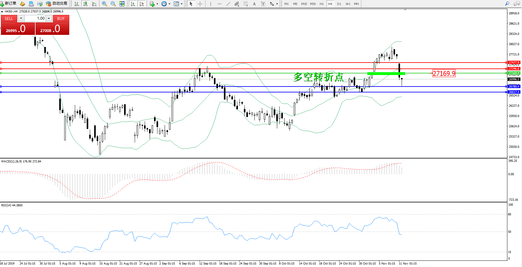 恒指HK50 ——4小时K线图显示: