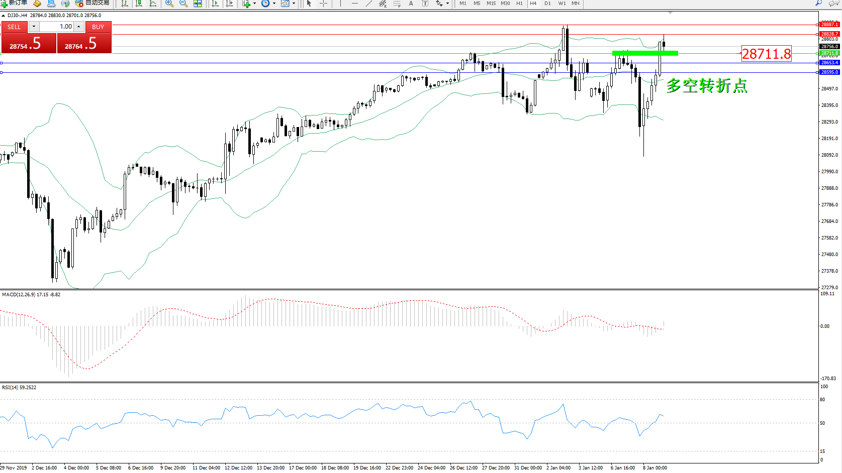 道琼斯指数DJ30—— 4小时K线图显示: