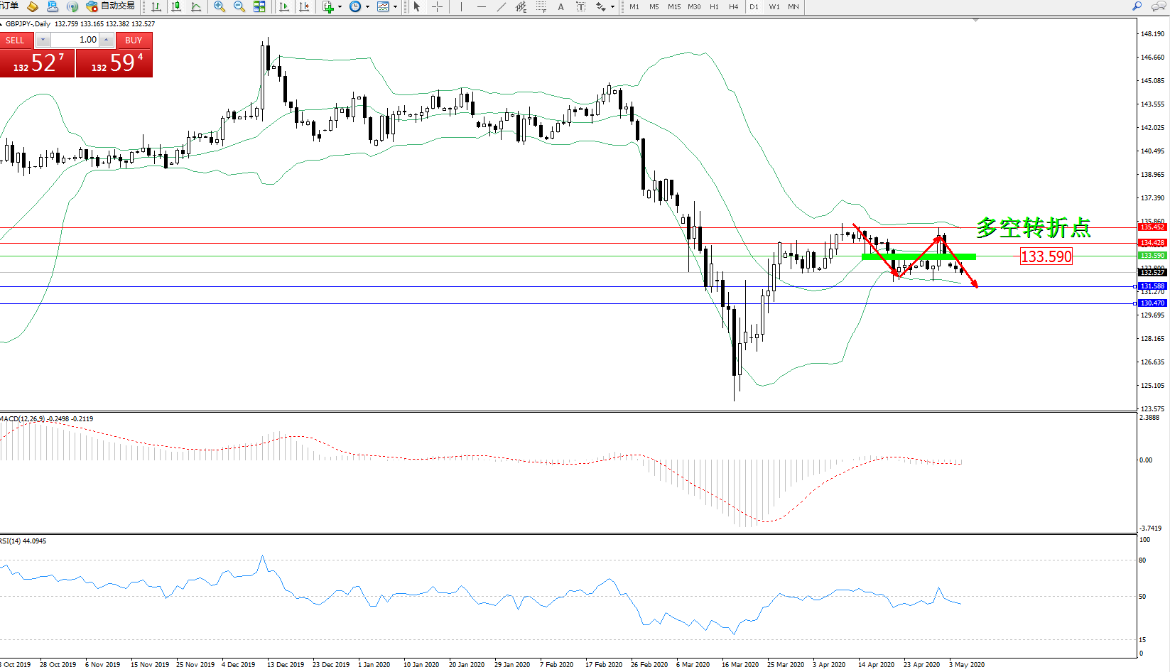 交易策略:133.590下方看跌,目标131.588、130.470