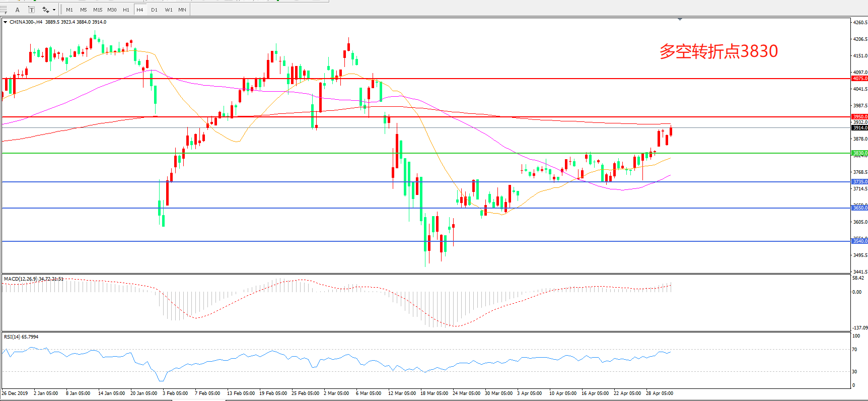 4小时图看,沪深300震荡走高,三连阳的K线形态鼓舞了多头上攻的士气,3927成为短期阻力,均线系统拐头向上,MACD红柱增加,RSI指标走平,日内延续上行概率较大。