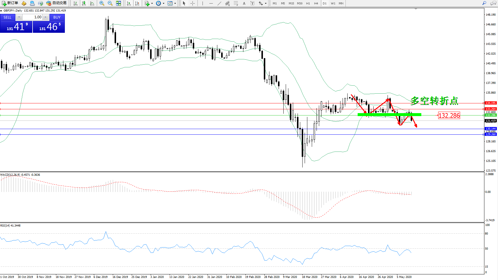 交易策略:132.286下方看跌,目标130.144129.260