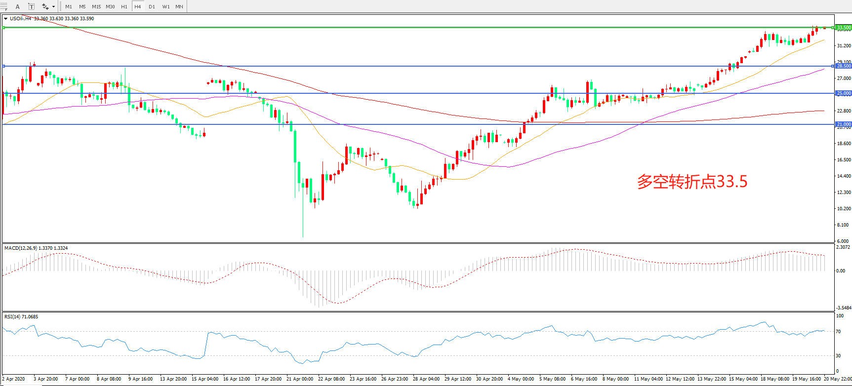 周三(5月20日),美国EIA原油库存意外减少498.20万桶,好于预期,但成品油库存表现不佳,油价涨幅受限,美国WTI原油震荡走高,收报33.5美元/桶。高盛表示,全球石油需求的改善以及欧佩克+协议之外的减产速度快于预期,将使6月份石油市场陷入短缺。