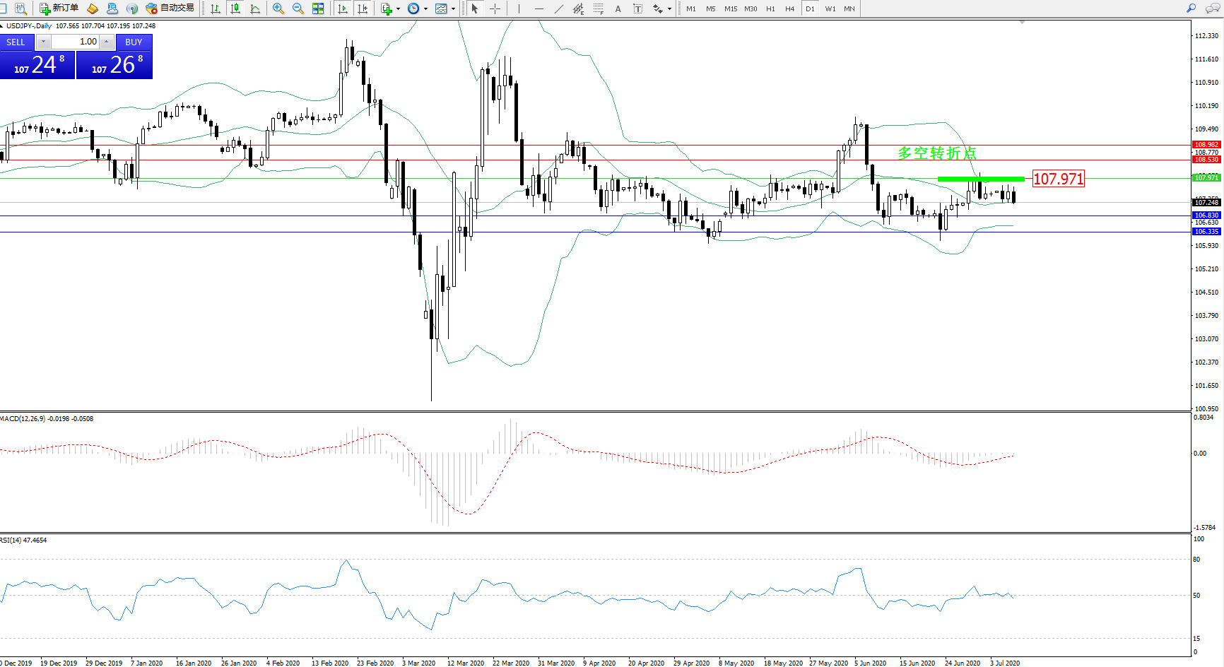交易策略:107.971下方看跌,目标106.830、106.335