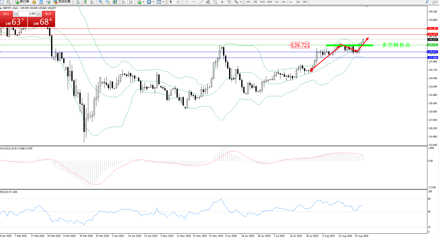 交易策略:139.721上方看涨,目标141.431、142.367