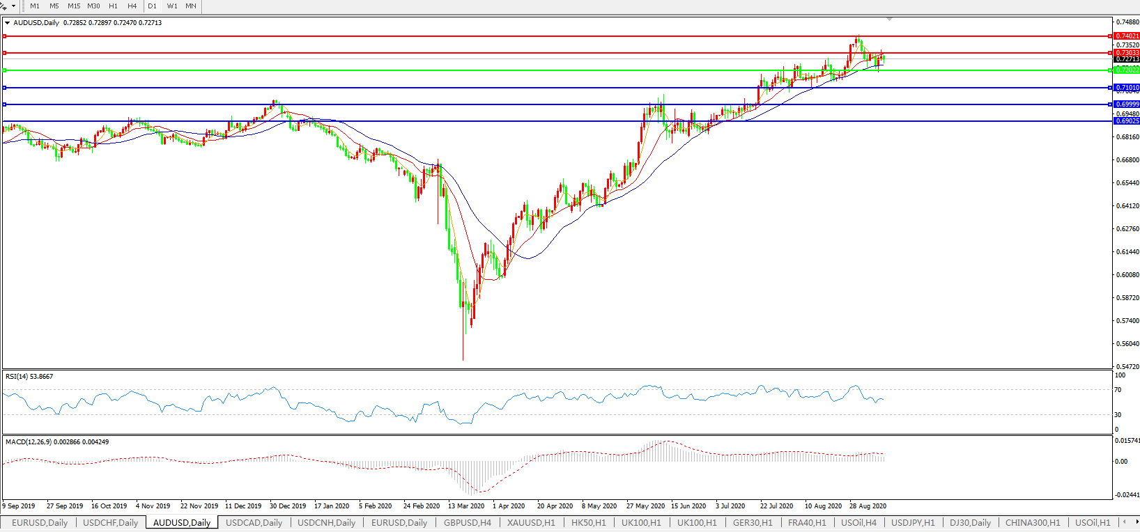 交易策略:0.7200上方看涨,目标0.7300、0.7400