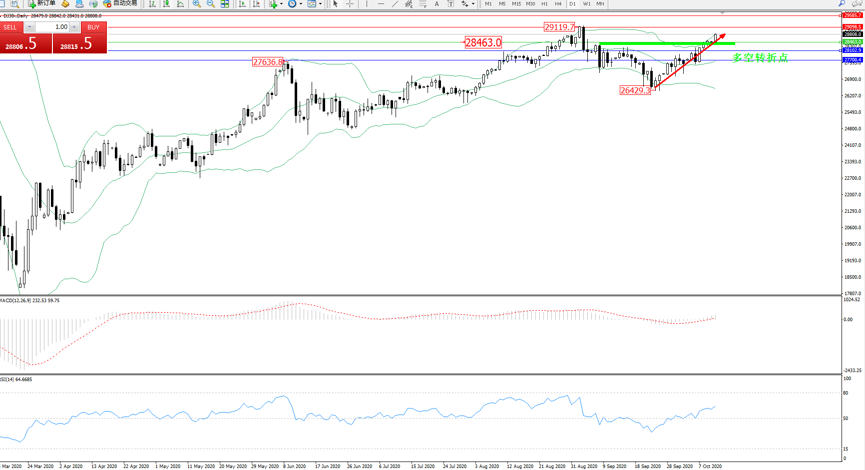 交易策略:28463上方看涨,目标29098、29585