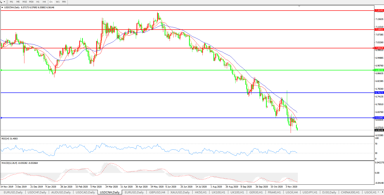 美元兑人民币USDCNH 日线图: