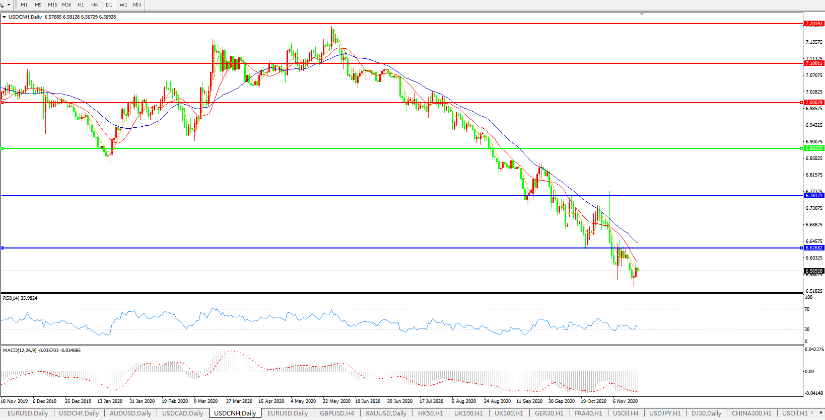 美元兑人民币USDCNH 日线图: