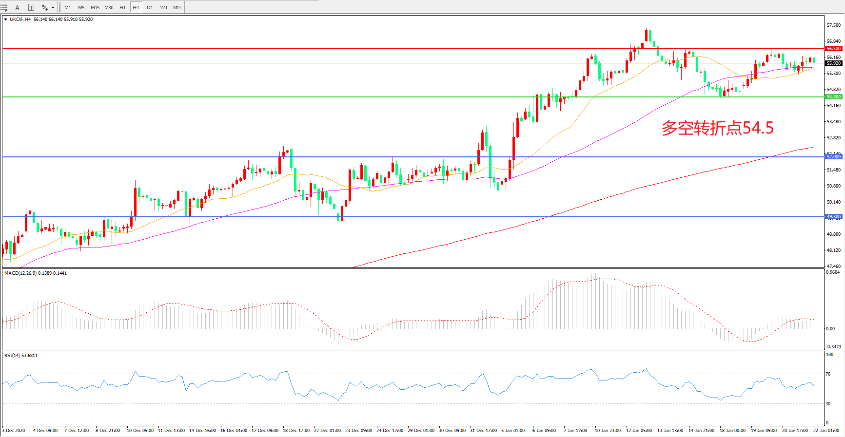 交易策略:  在54.50之上看涨,目标56.50    60.00
