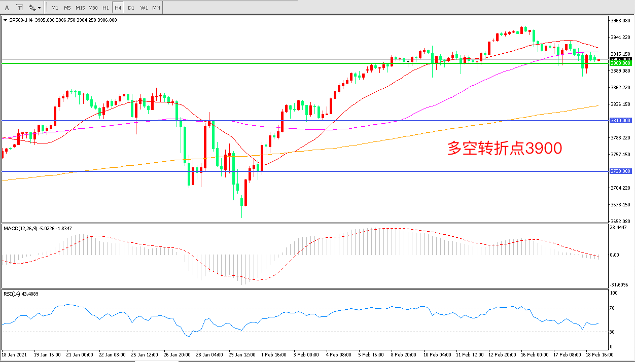 4小时图看,标普500延续高位震荡,整体波幅不大,3900成为短期多空分水岭,均线系统逐渐走平,MACD红柱缩短,RSI指标走平,日内延续震荡概率较大。