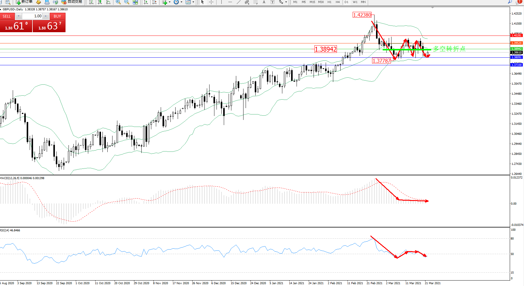 技术点评:高位空头动力震荡回撤下行后,长时间维持在布林带指标中下轨区间弱势整理平移中,布林带指标呈收口走势中,空头有进一步向下移动迹象,此前1.37787位置近在咫尺破位在即,MACD指标高位空头动力下行后维持整理平移后有向下移动迹象,RSI指标纠结于50均衡线附近持续整理中;