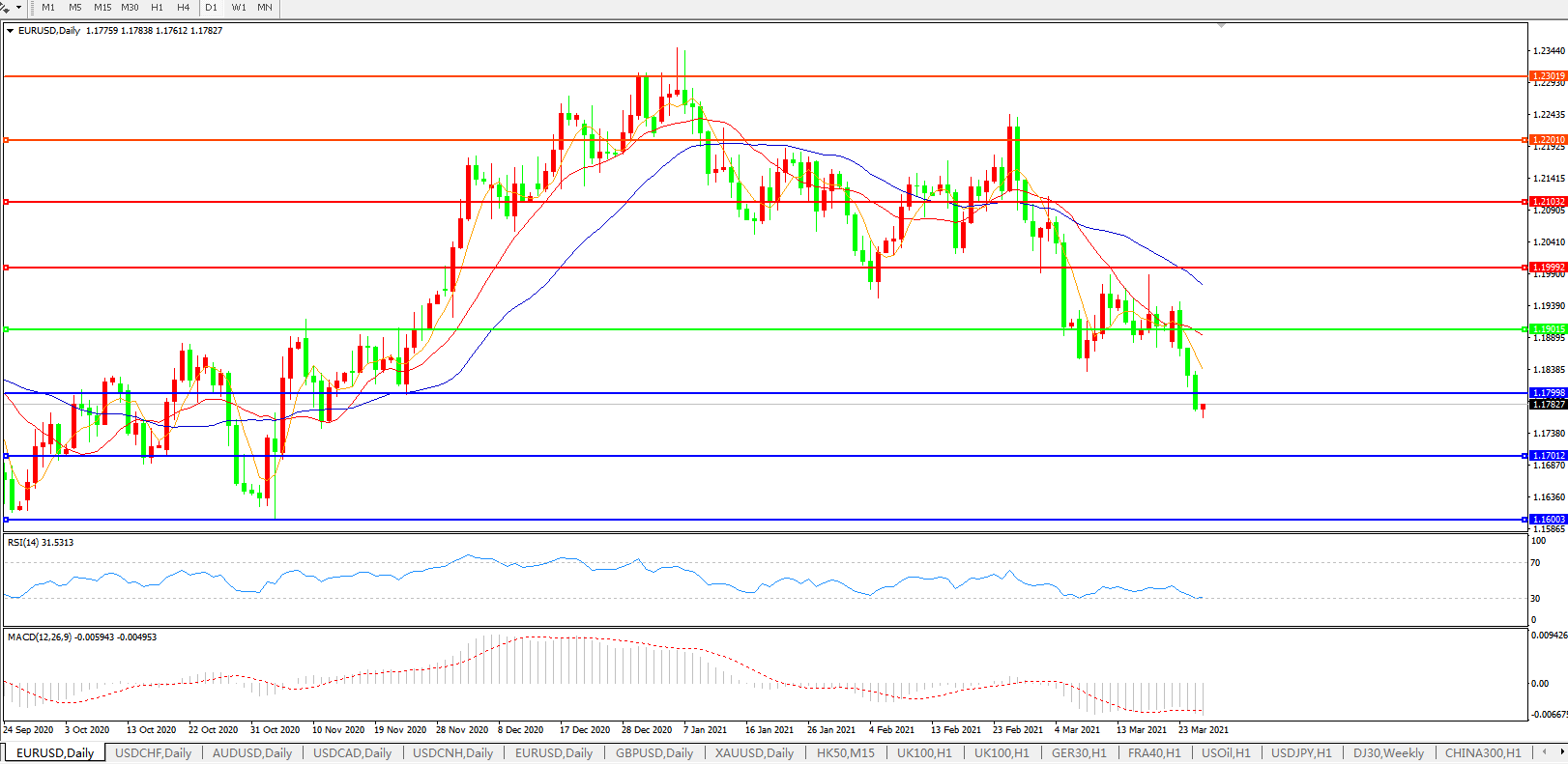 对欧洲延长封锁的担忧也令市场承压。欧洲领导人举行会议,讨论如何在新冠疫苗接种开局缓慢的情况下增加疫苗供应。欧元兑美元跌0.41%至1.1764,盘中一度跌至去年11月12日以来的最低水平1.1762;分析师预计欧元兑美元可能回落到1.16美元区间,因欧洲经济复苏落后于美国。美国银行的Paul Ciana周四在一份报告中称,欧元兑美元此前在1.23左右见顶,并且未能突破1.2555高点,意味着一个长期的三角形态正在构筑中,并有可能在2021年底的时候见到1.09。