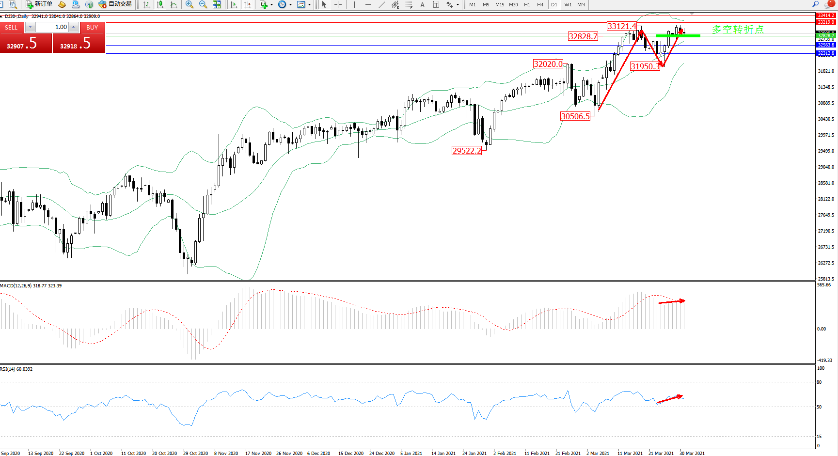 技术点评:多头动力延续布林带指标通道内持续震荡上扬,高位抵达33121位置后遇阻回撤,抵达31950位置得到支撑多头动力伺机入场反转上扬,多头不断向上拉升,处于中上轨区间持续震荡平移,布林带指标呈张口走势后开始收口向上移动,MACD指标处于多头区域高位整理平移,RSI指标处于多头区域高位弱势震荡回撤后开始反转上移;