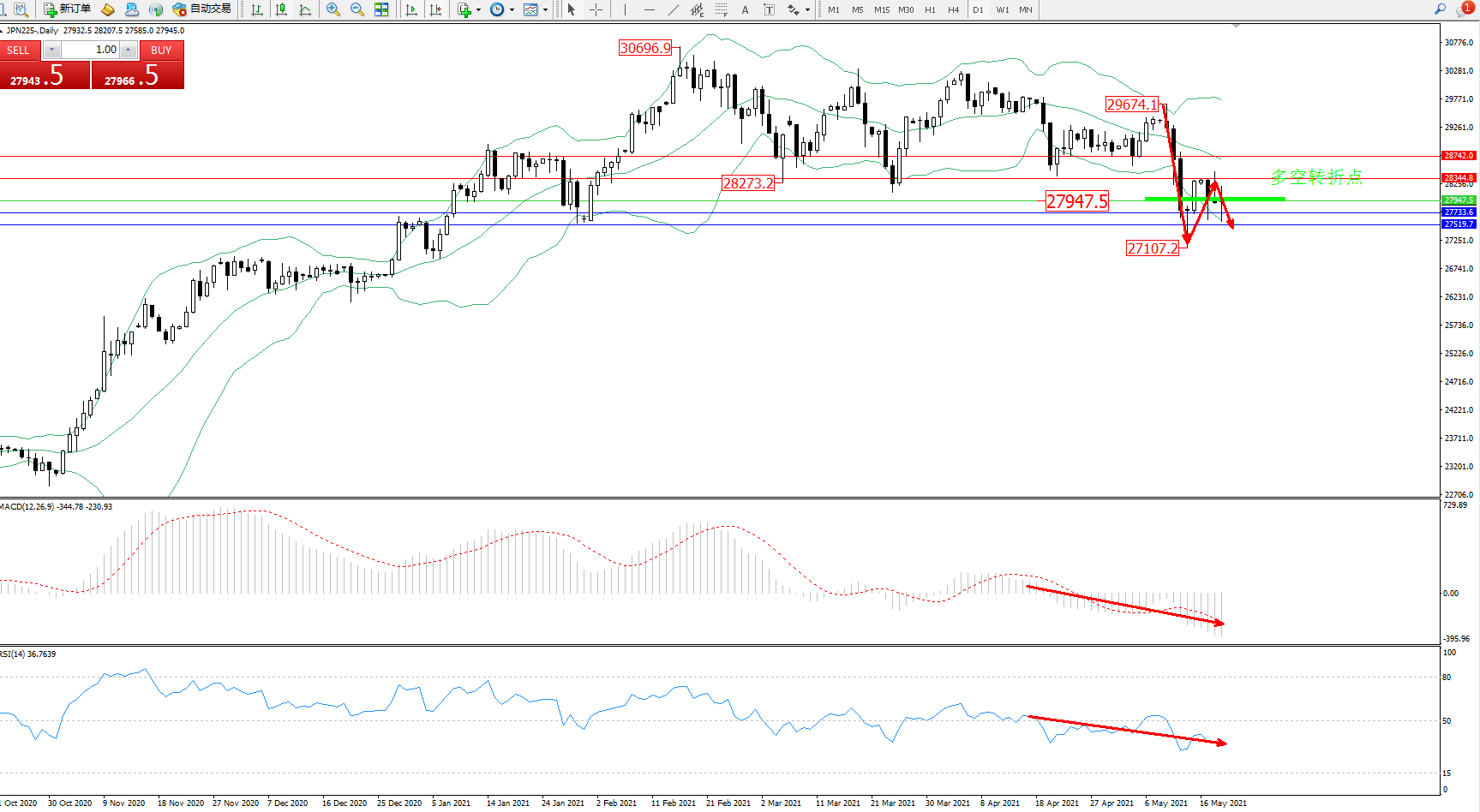 日经225指数5月19日(周三)收盘下跌364.34点,跌幅1.28%,报28042.50点。日本央行行长黑田东彦:如果需要,日本央行会毫不犹豫地增加宽松政策,2%的CPI目标的重要性毋庸置疑,2%的CPI目标有助于稳定汇率,据日本共同社:日本将禁止7个地区和国家的外国人入境。日内日央行长黑田东彦在讲话中继续释放态度谨慎的措辞,称经济前景仍偏向下行,这意味着日本央行也仍在货币政策前景上继续留了一手,日本本土疫情仍然严峻而疫苗接种进程缓慢的局面,也令日经难以为投资者所看好。近日以来亚太多地进一步抬头恶化的疫情,以及围绕东京奥运会是否仍该如期举办的争议。