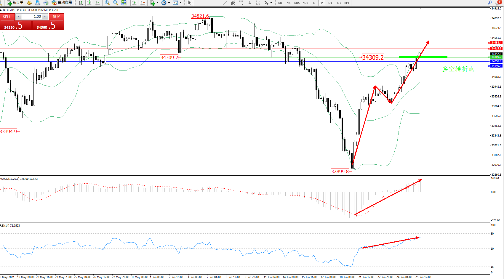 道琼斯指数DJ30——4小时K线图显示: