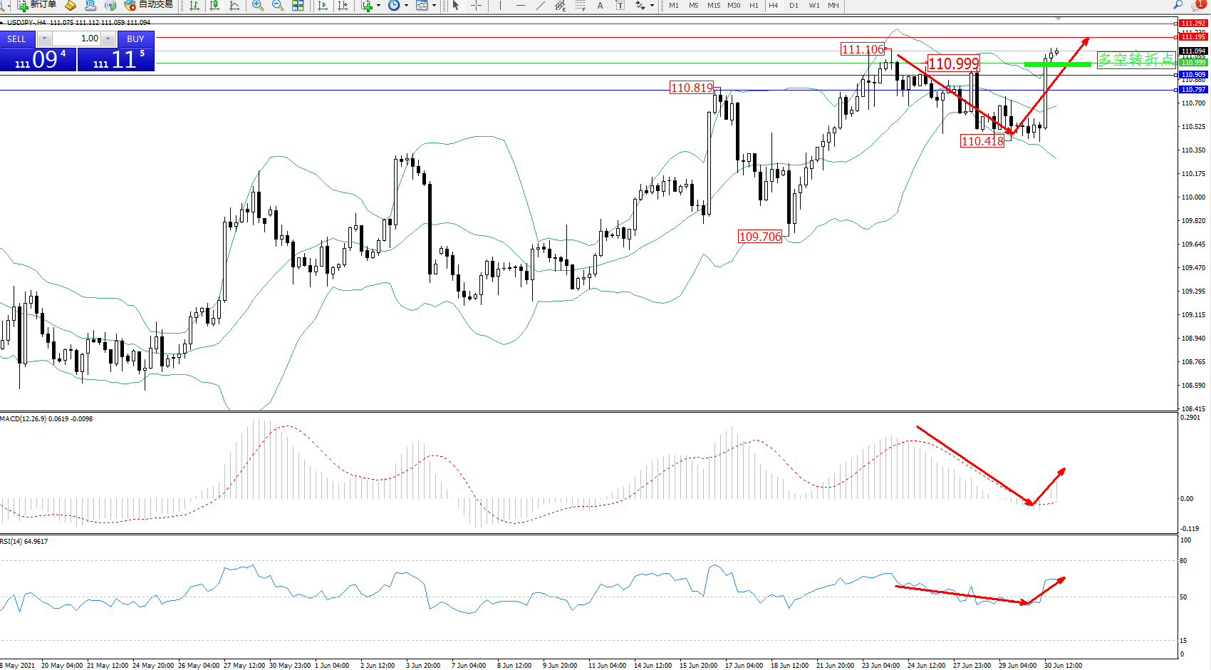 技术点评:空头动力维持在布林带指标通道中下轨区间持续整理平移后,多头动力伺机入场,强势拉升,触及上轨附近节点后开始徘徊,有继续拉升上扬态势,此前高位111.106位置近在咫尺破位在即,MACD指标处于0轴线持续震荡后多头动力不断拉升中,RSI指标纠结于50均衡线附近整理后强势上扬中;