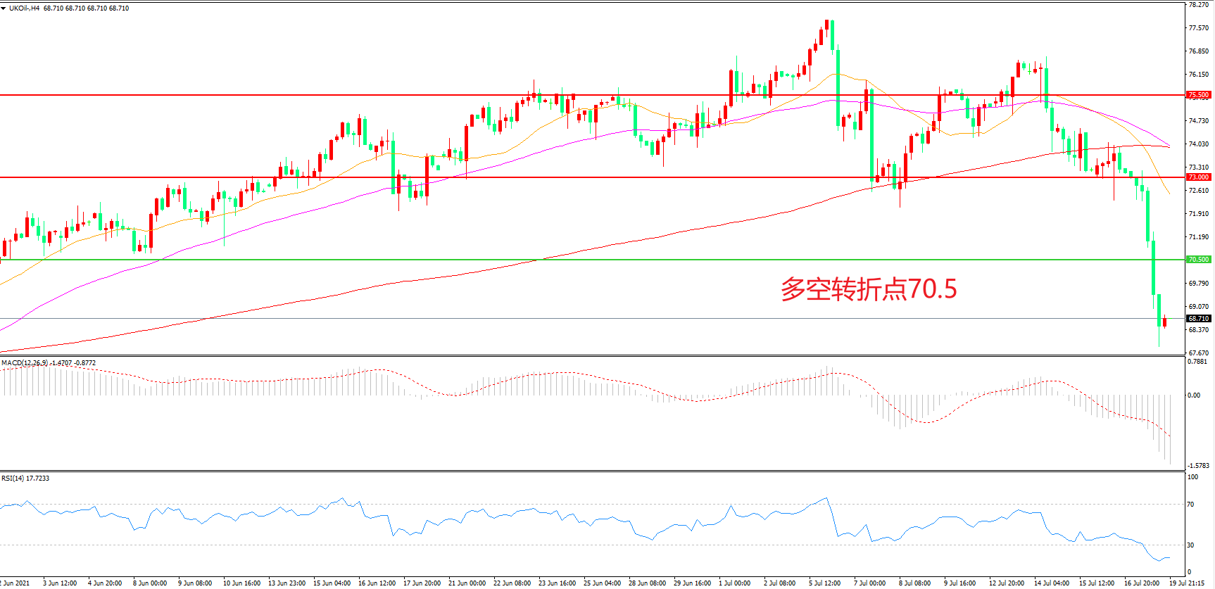 周一(7月19日),由于市场普遍怀疑新冠Delta变种病毒的爆发会延缓全球经济复苏势头,恐慌情绪骤然升温,且OPEC+达成逐月增产的协议,并将并将沙特、阿联酋、俄罗斯和伊拉克的产油基准均上调导致油价“闪崩”,布伦特原油大幅下跌,收报68.71美元/桶,如果新冠疫情回潮激起了的避险情绪继续高涨,油价可能会出现进一步下跌。