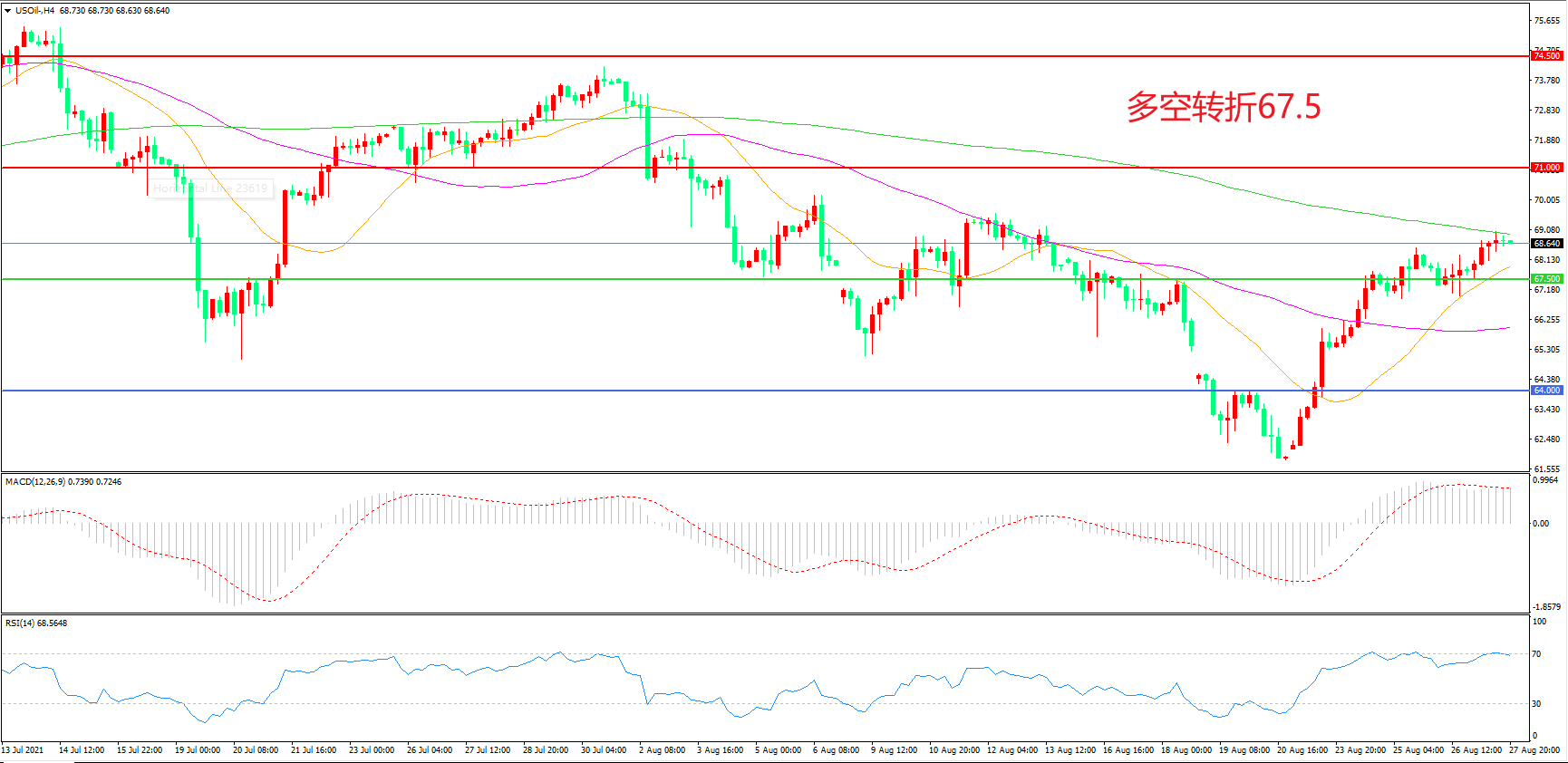 交易策略:在67.50之上看涨,目标71.00 74.50