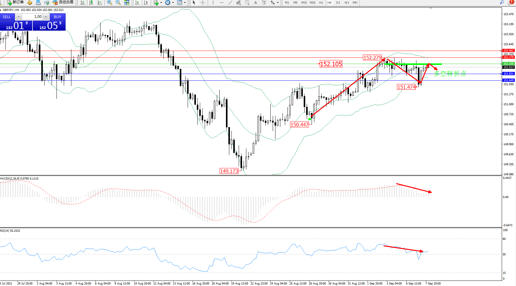 备选策略:152.105上方看涨,目标152.279、152.462