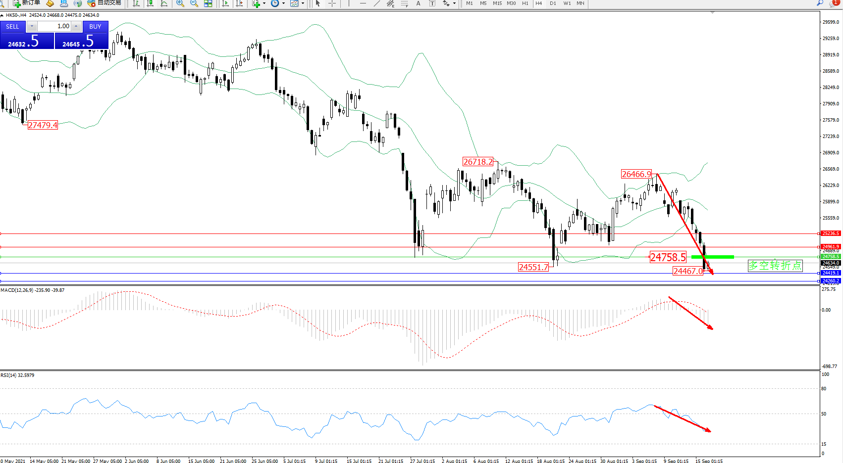 技术点评:空头动力延续布林带指标通道下轨附近持续下探,低位跌破前期低位24551位置后抵达24467位置得到短暂支撑,布林带指标呈张口走势良好,RSI指标空头动力持续震荡下行进入空头区域不断下行,MACD指标处于50均衡线下方空头区域不断下探;