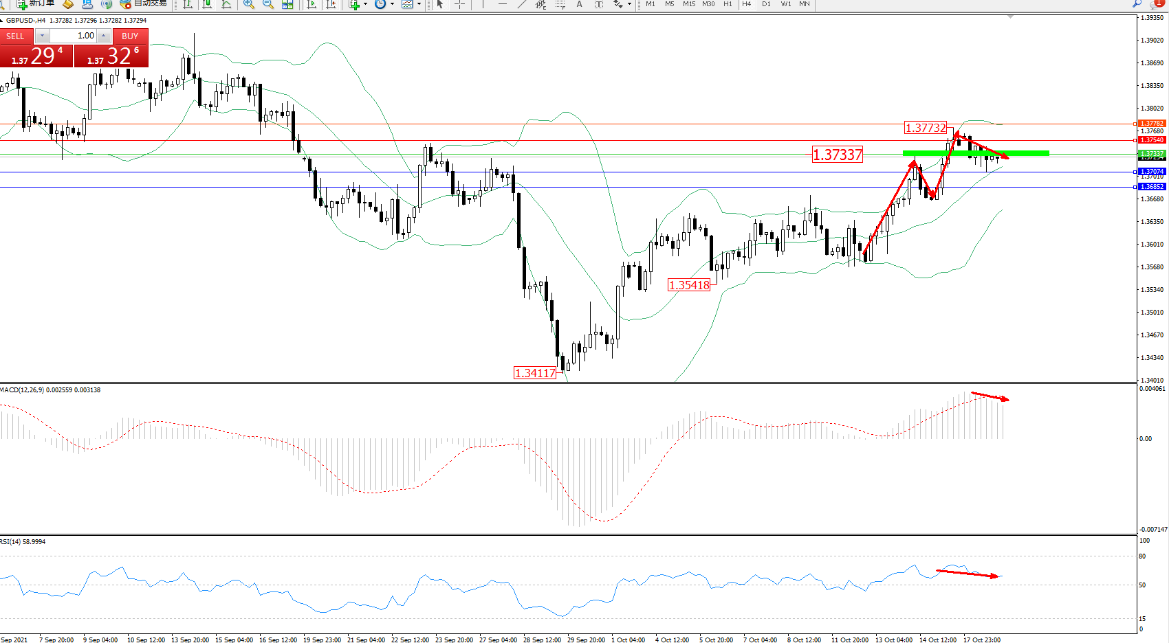 交易策略:1.37337下方看跌,目标1.37074、1.36852