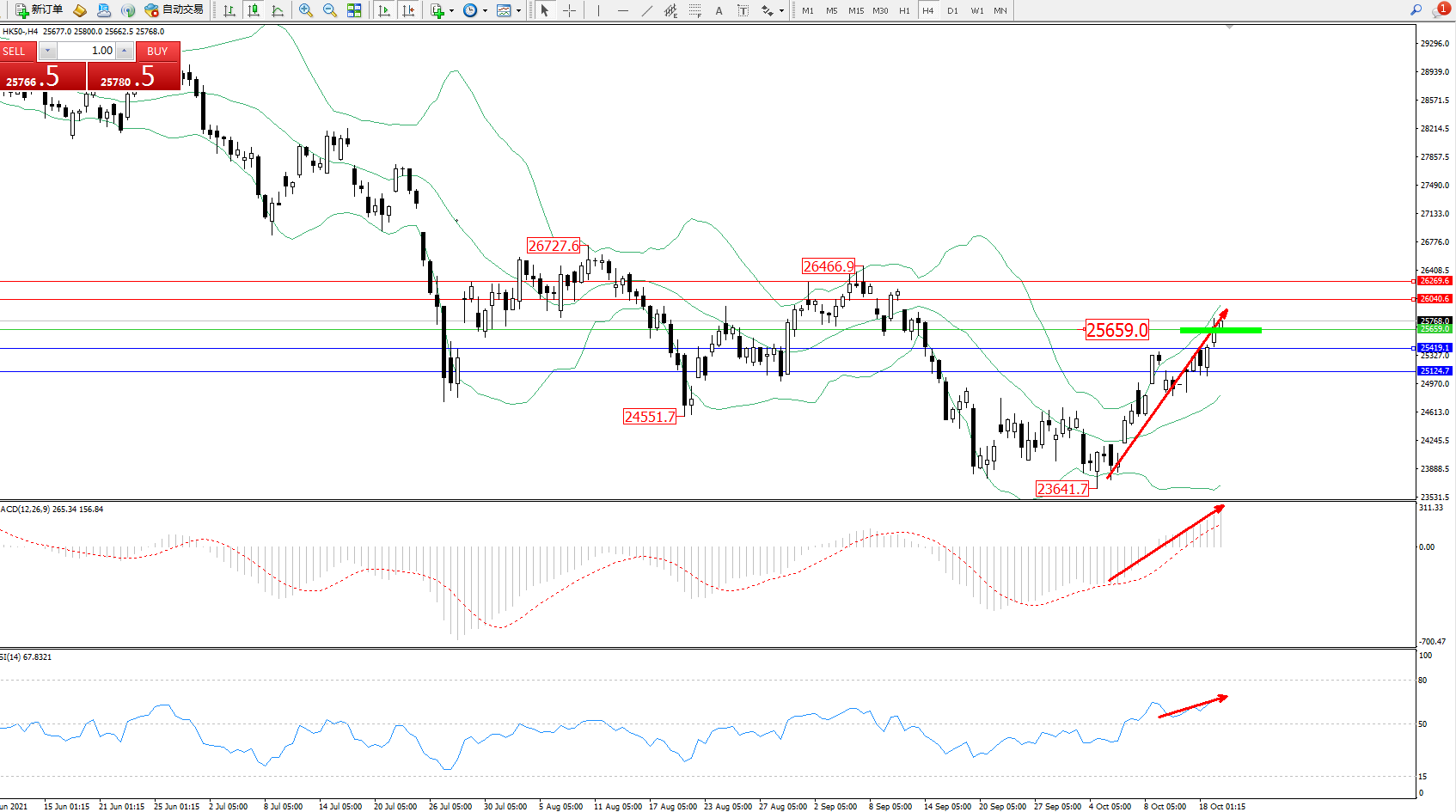 恒指HK50 ——4小时K线图显示: