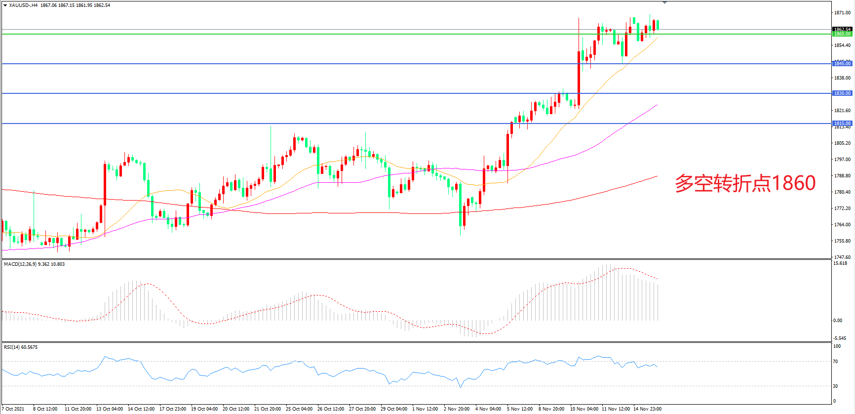 4小时图看,金价连续拉升后高位震荡,短期走势偏强,均线系统成为下方支撑,1860成为多空分水岭,MACD红柱缩短,RSI指标走平,日内震荡上行概率较大。