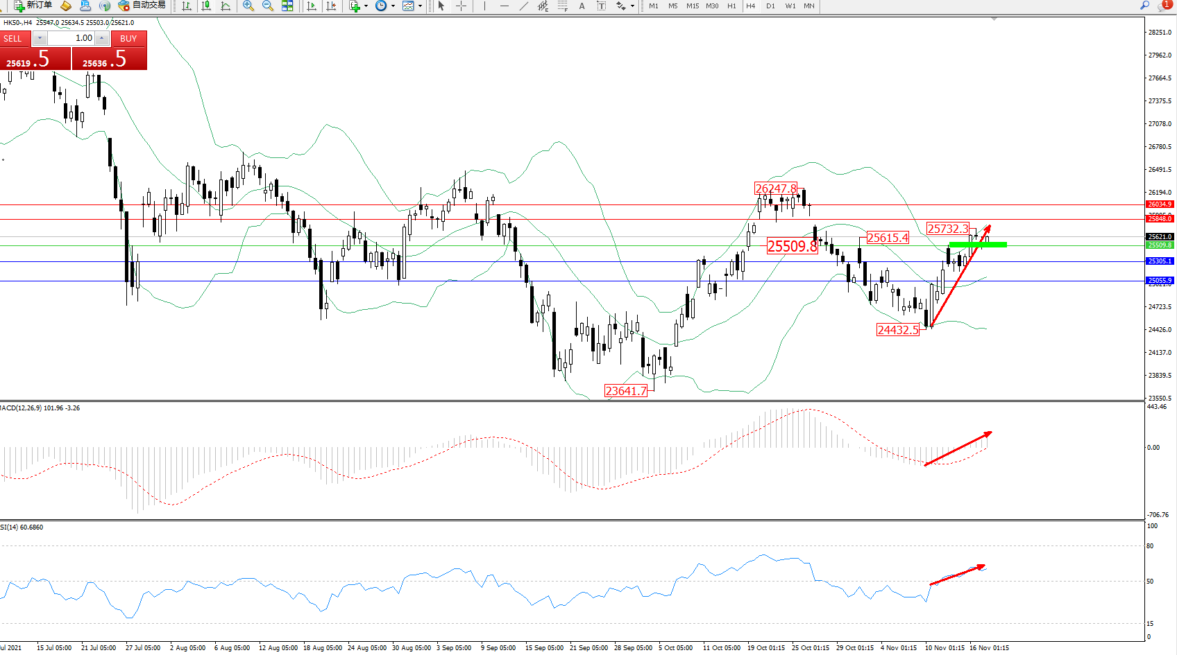 技术点评:多头动力低位强势拉升震荡上扬,延续布林带指标上轨附近持续向上移动中,高位抵达25732位置开始整理,短期未见止步迹象,布林带指标呈收口走势后开始缓慢张口,MACD指标低位多头动力维持整理上移至0轴线上方徘徊,RSI指标处于多头区域持续震荡上移中;