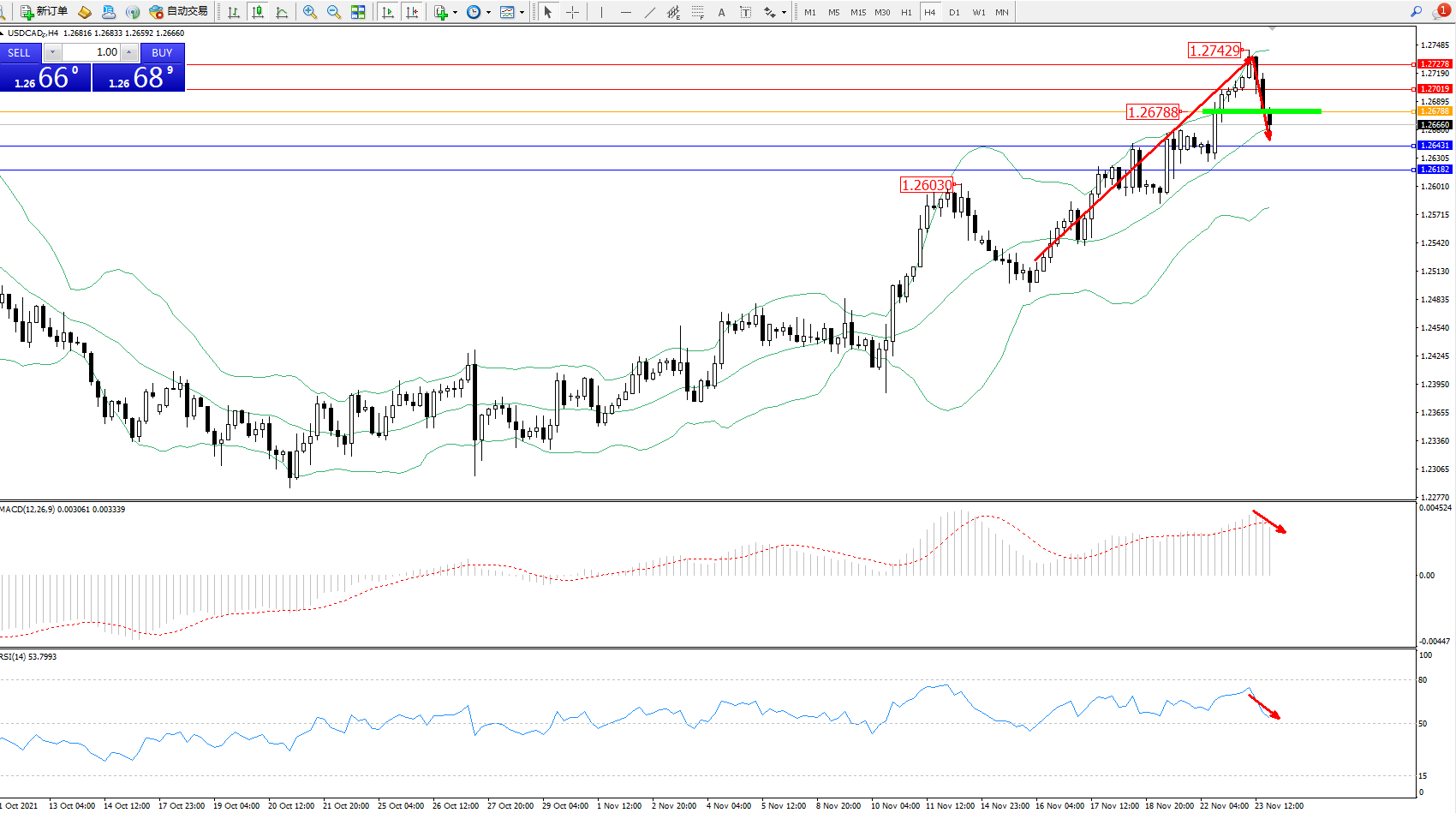 美元加元USDCAD——4小时K线图显示: